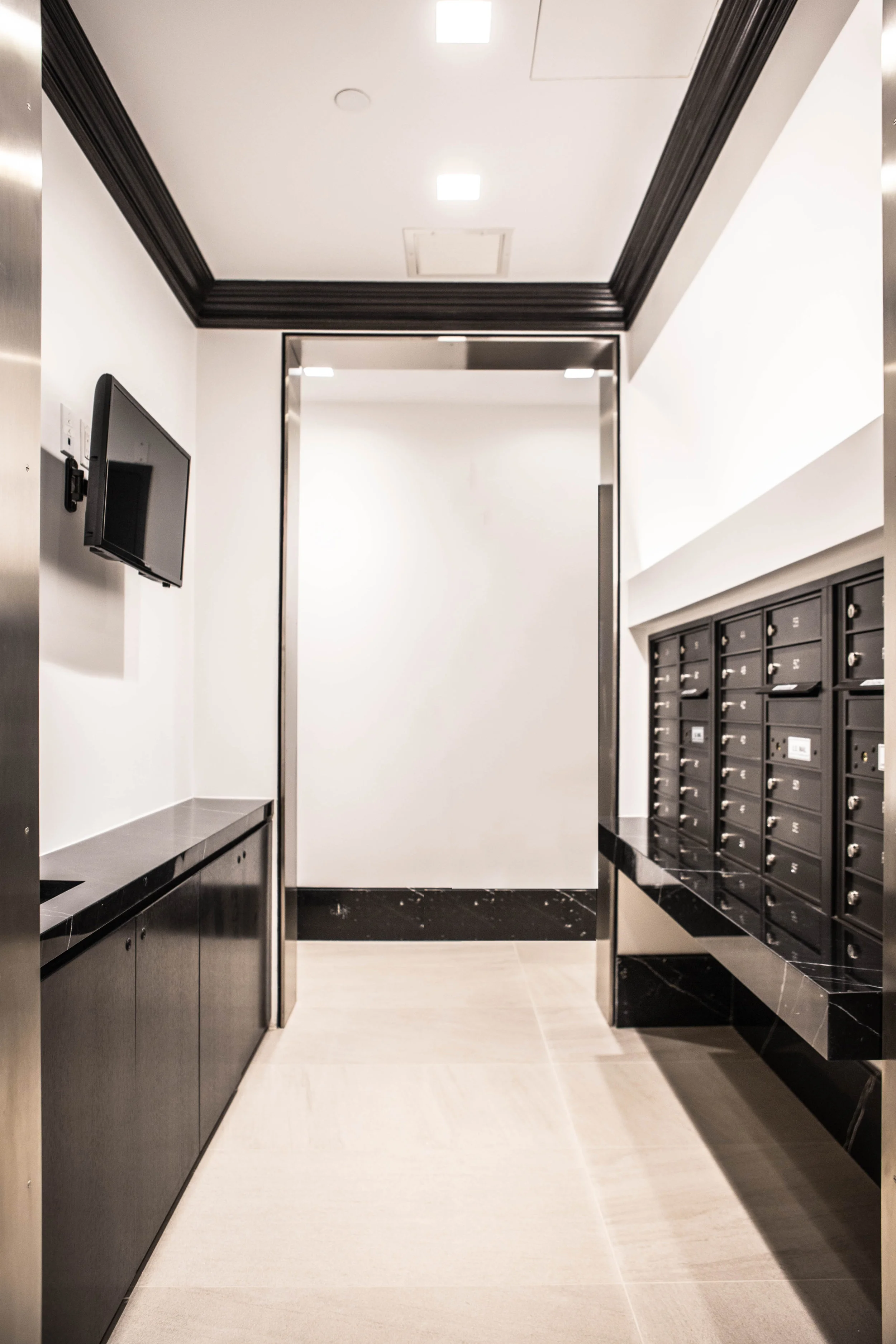 The residential lobby is designed to give the building occupants a convenient experience; the concierge desk is placed front and center to assist building occupants with large packages before they proceed to the mail room and the elevator vestibule. The material palates used are simple, timeless and economical; the laminated walnut wall panels with stainless strips are used to create a classy and timeless framework for the entire lobby experience.